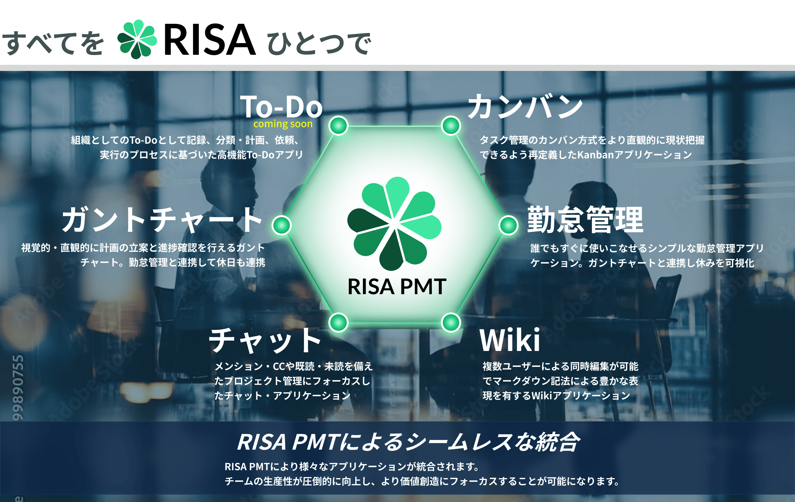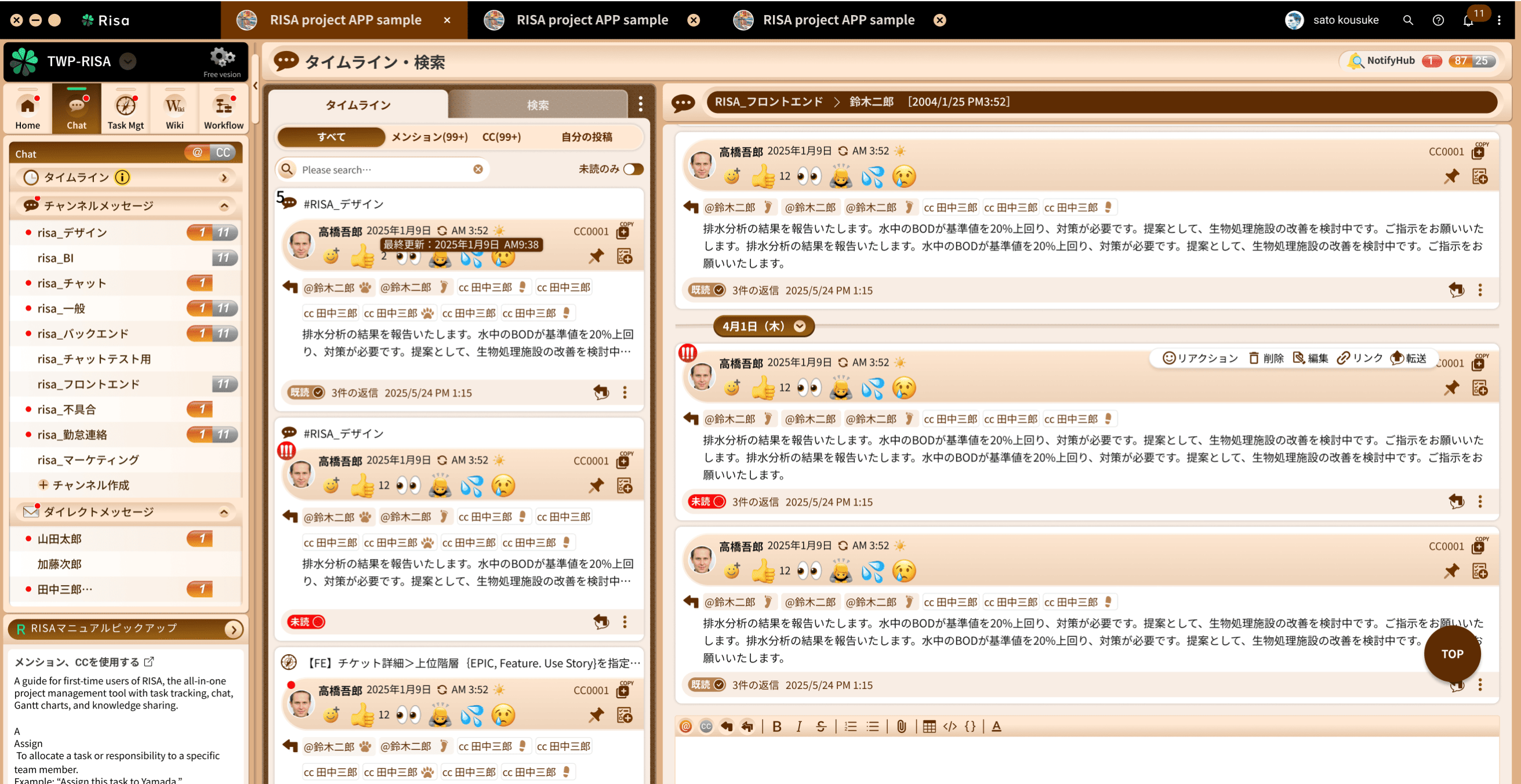 RISAのチャットは、情報が整理され検索コストを下げるどともに抜け漏れを防止しコミュニケーションを加速させます。