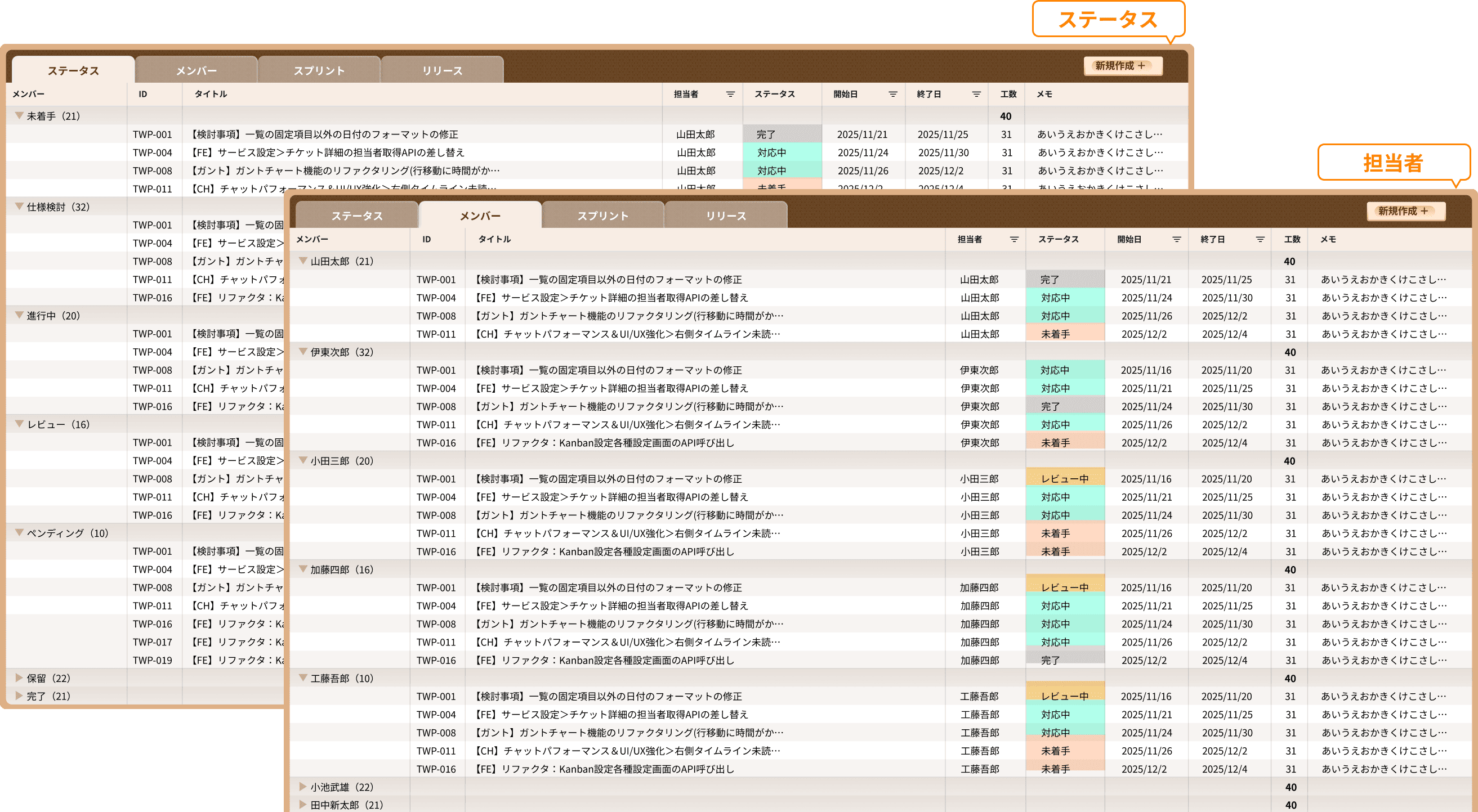 - タブで切り口を変え、絞り込みと組み合わせることで進捗を瞬時に把握