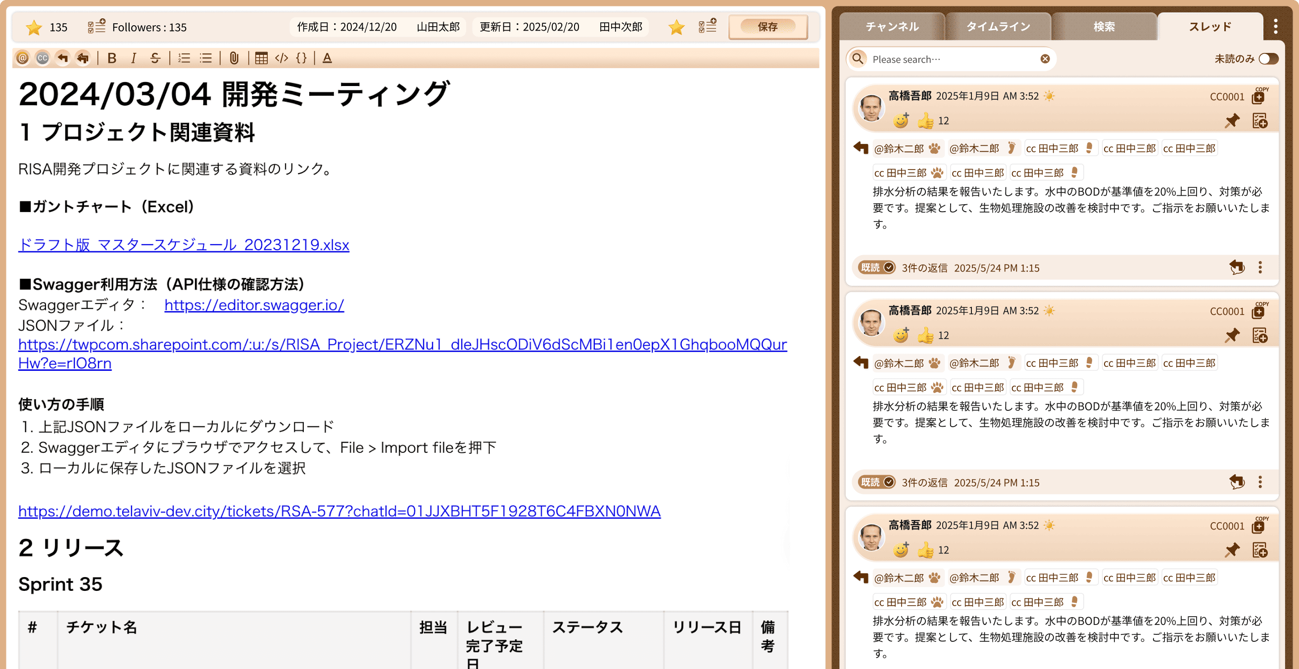 関係者へのメッセージや、ドキュメントへの質問などをWiki内で行うことができます。