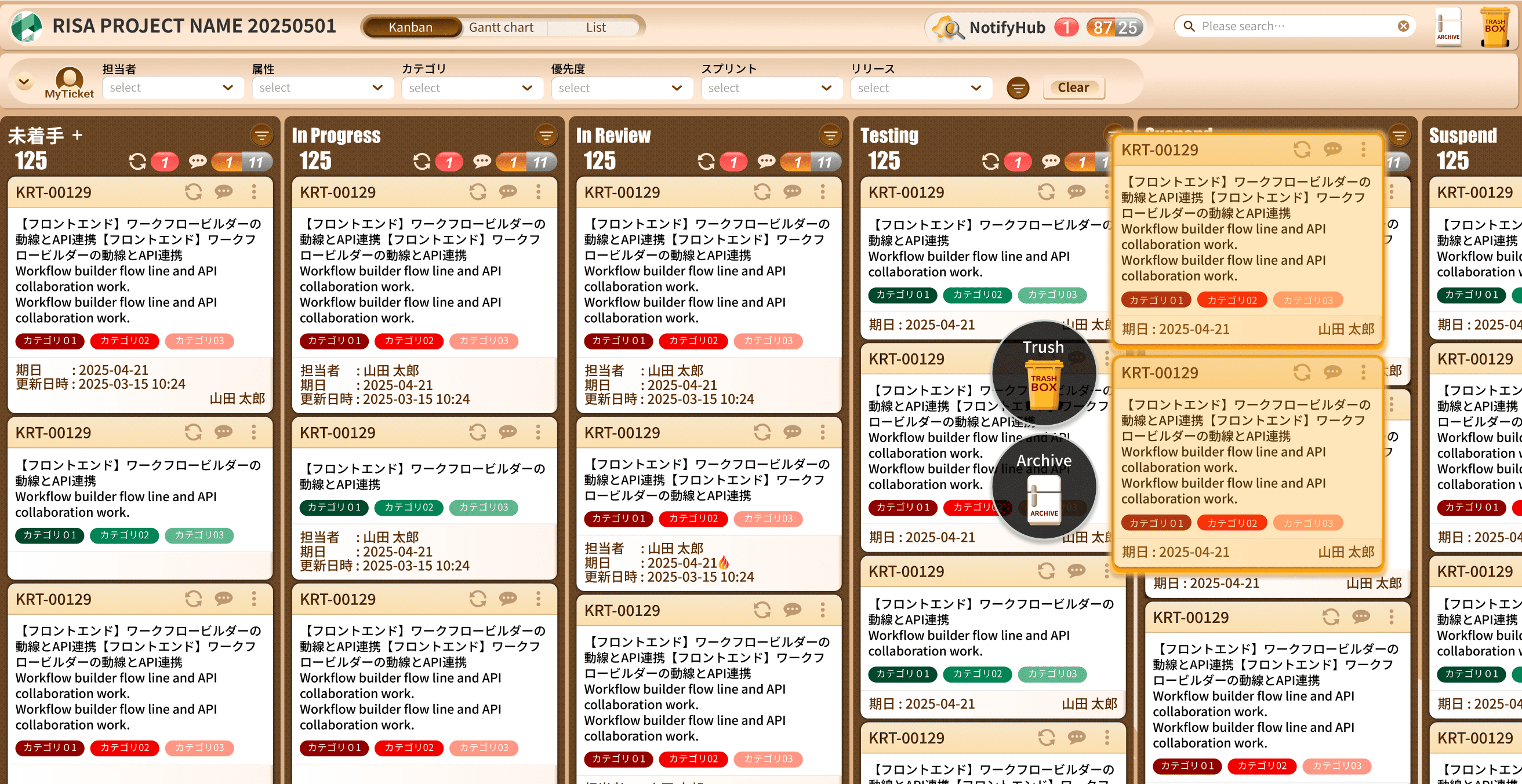 複数枚のチケットを一括で移動・削除・アーカイブでき、直観的な操作でタスク管理が容易になります。