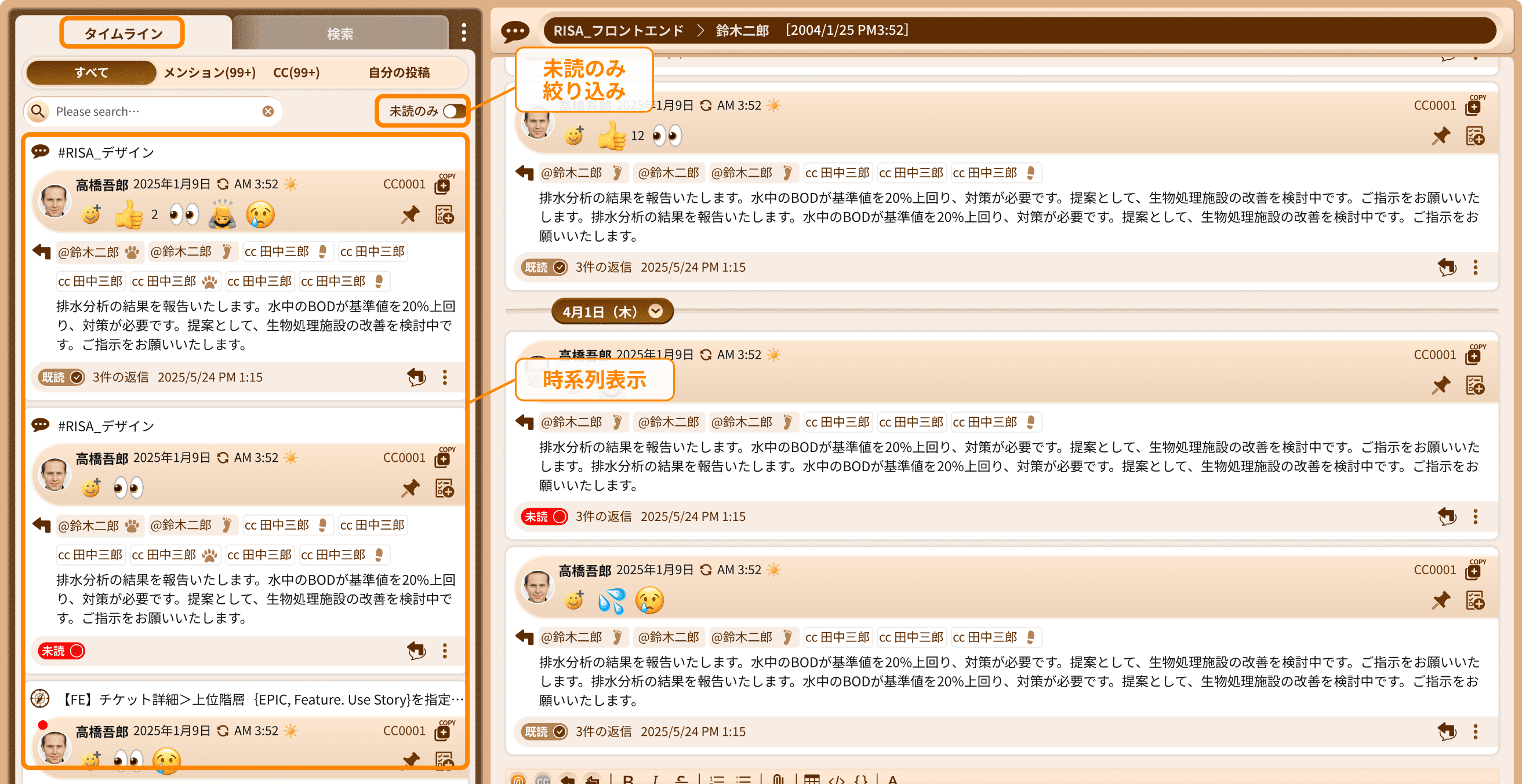 - メンション・CCや未読・既読を備え、『確認の抜け漏れ』『返信の遅れ』『放置』を防止